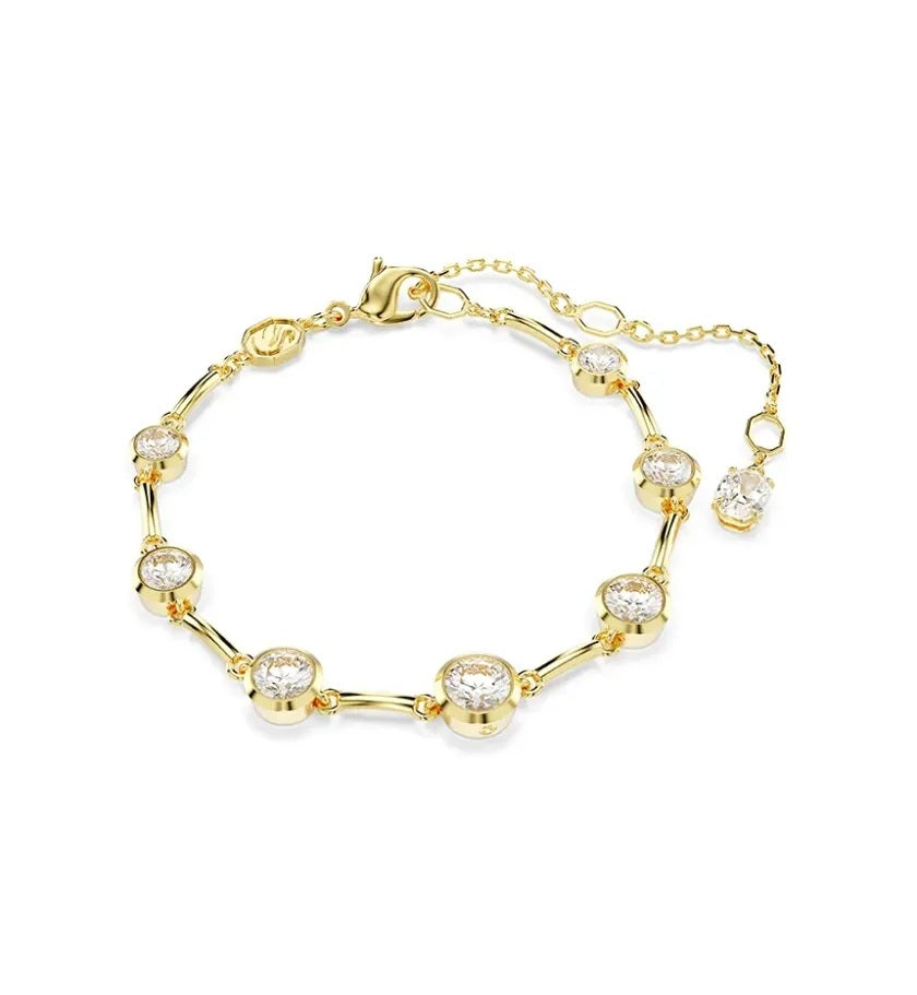 Swarovski Tennis-Armband Imber 5705465. In diesem eleganten Armband aus der Imber-Familie herrscht schlichte Eleganz. Das in Goldtönen plattierte Design ist mit sieben Swarovski Zirconia im Rundschliff verziert, die jeweils in einer modernen Krappenfassung gehalten werden. Für eine verstellbare Passform ist der Karabinerhaken mit drei Positionen für drei passende Größen und einem einzelnen Swarovski Zirconia am Ende des Verlängerungselements ausgestattet. Tragen Sie dieses Armband zusammen mit einer passenden Imber-Halskette, um seine raffinierte Wirkung zu verstärken. Artikel-Nr.: 5705465. Kollektion: Imber. Länge (min. - max.): 15,5 - 20,5 cm. Dekorationsgröße: 0,8 x 0,8 cm. Material: Goldplattierung, Zirkonia. Farbe: Weiß. Verschlussart: Karabinerhaken.